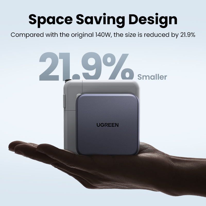 - Kích thước nhỏ, hiệu quả tối ưu: Công nghệ GaN mang tính cách mạng kết hợp với phích cắm có thể gập lại giúp giảm 22% kích thước Nexode 140W so với bộ sạc 140W gốc.