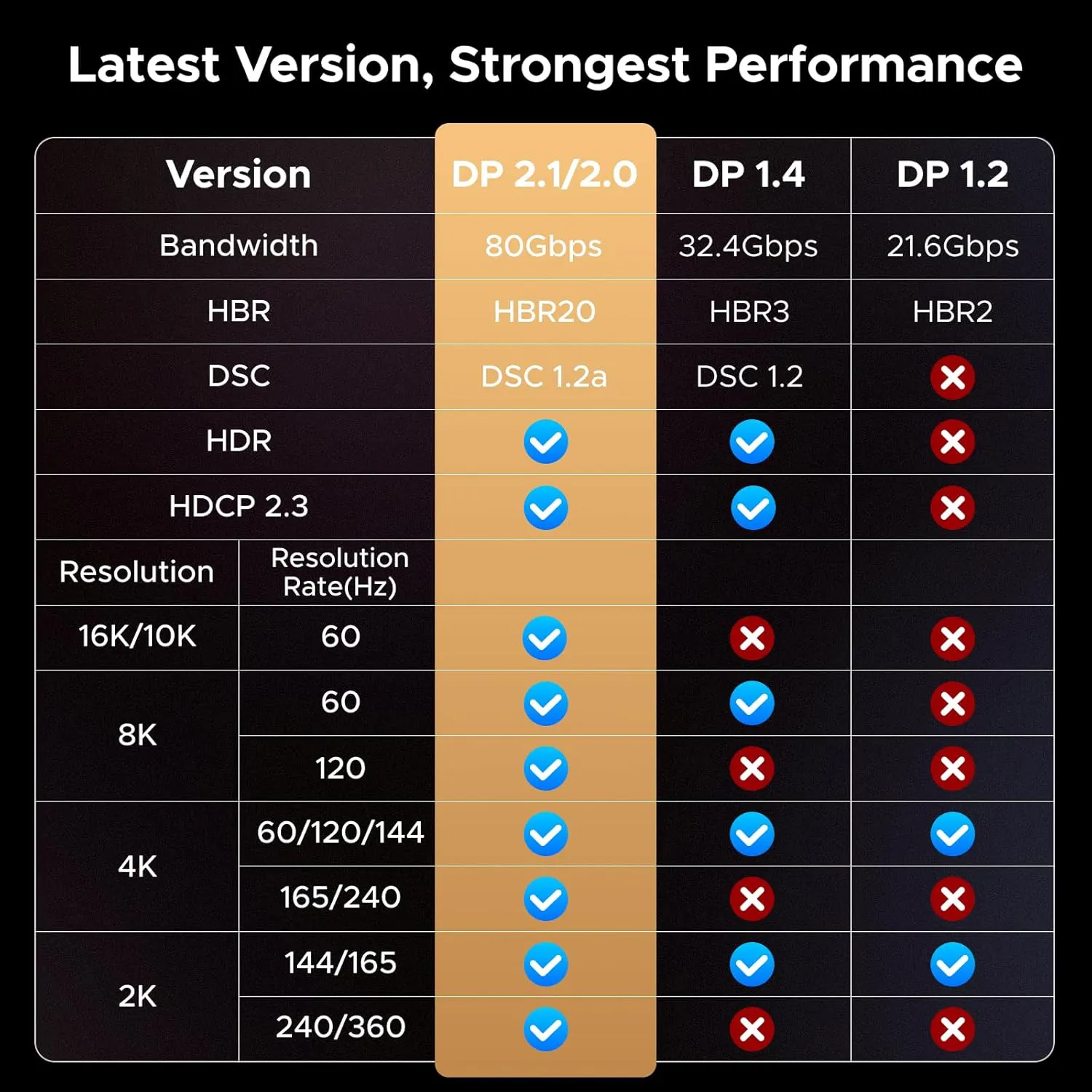 - Một số laptop/PC cũ chỉ hỗ trợ DP 1.2/1.4 → mức độ phân giải tối đa sẽ thấp hơn DP 2.1 trên cáp. Kiểm tra specs nguồn nếu bạn muốn tận dụng tối đa