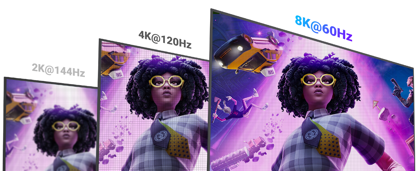 - 8K@60Hz, 8K@50Hz, 4K@120Hz, 4K@100Hz,1080P
