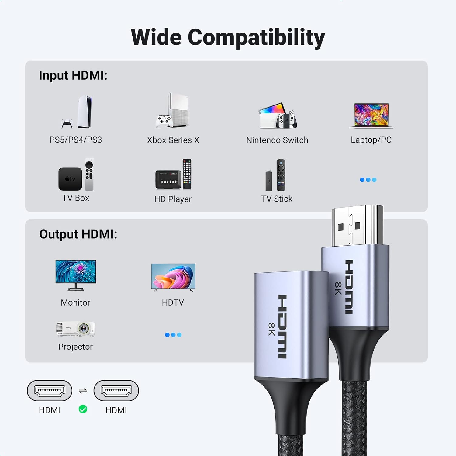 - Cáp HDMI 2.1 nối dài 15cm chuẩn 8K Ugreen 15518 thực hiện tất cả các chức năng của cáp nối dài 8K mà còn giải quyết các vấn đề về màn hình nhấp nháy, không đủ băng thông và các vấn đề khác khi sử dụng dây nối dài HDMI 8K. Bộ mở rộng HDMI ngắn lý tưởng để gắn TV vào TV treo tường