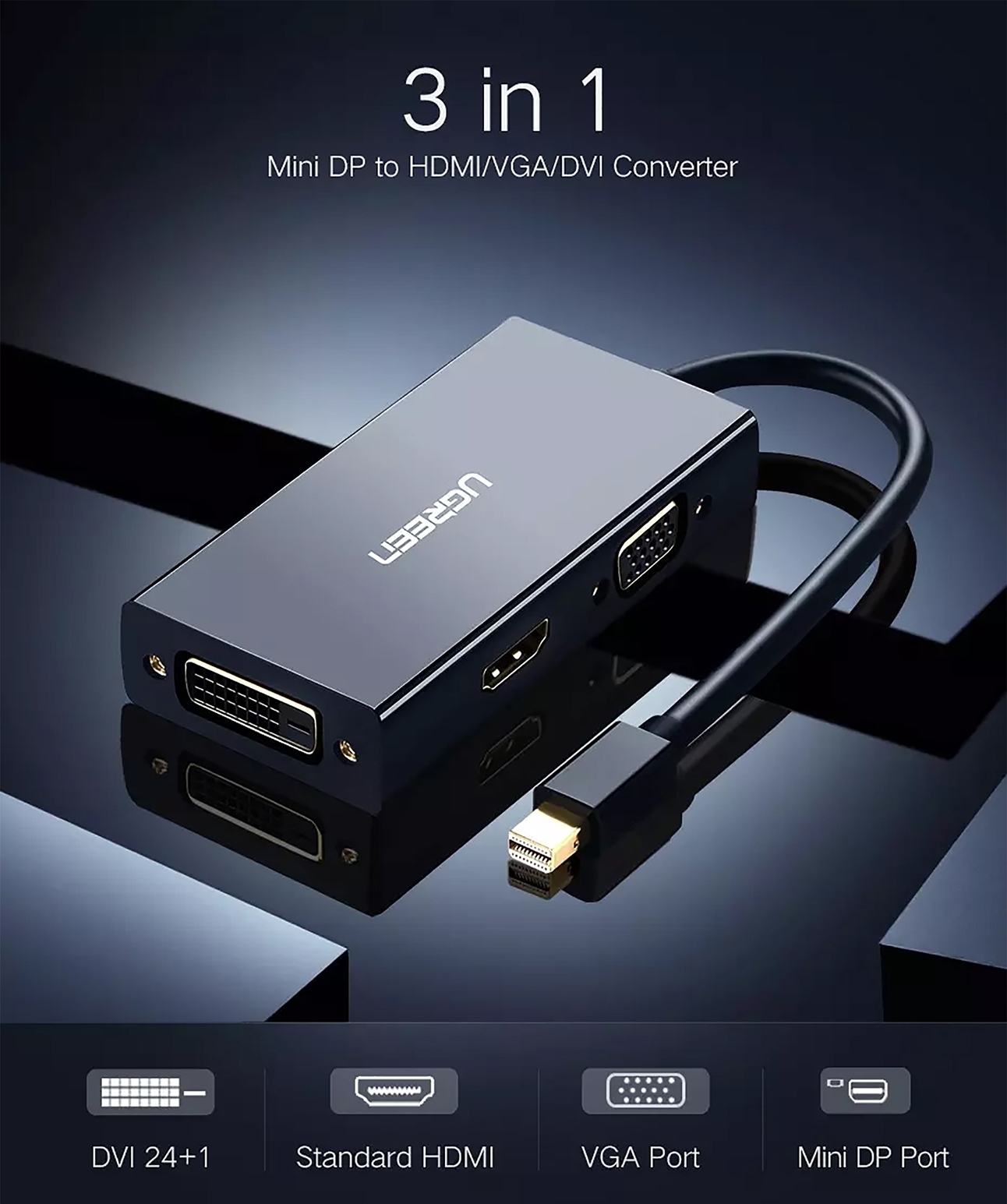 - Cáp chuyển Mini DisplayPort to HDMI, VGA, DVI Ugreen 20418, giúp bạn dễ dàng hơn trong việc chuyển đổi tín hình ảnh từ macbook, laptop,.. sang màn hình TV, màn hình máy tính, HDTV,... với chất lượng hình ảnh chân thực nhất.