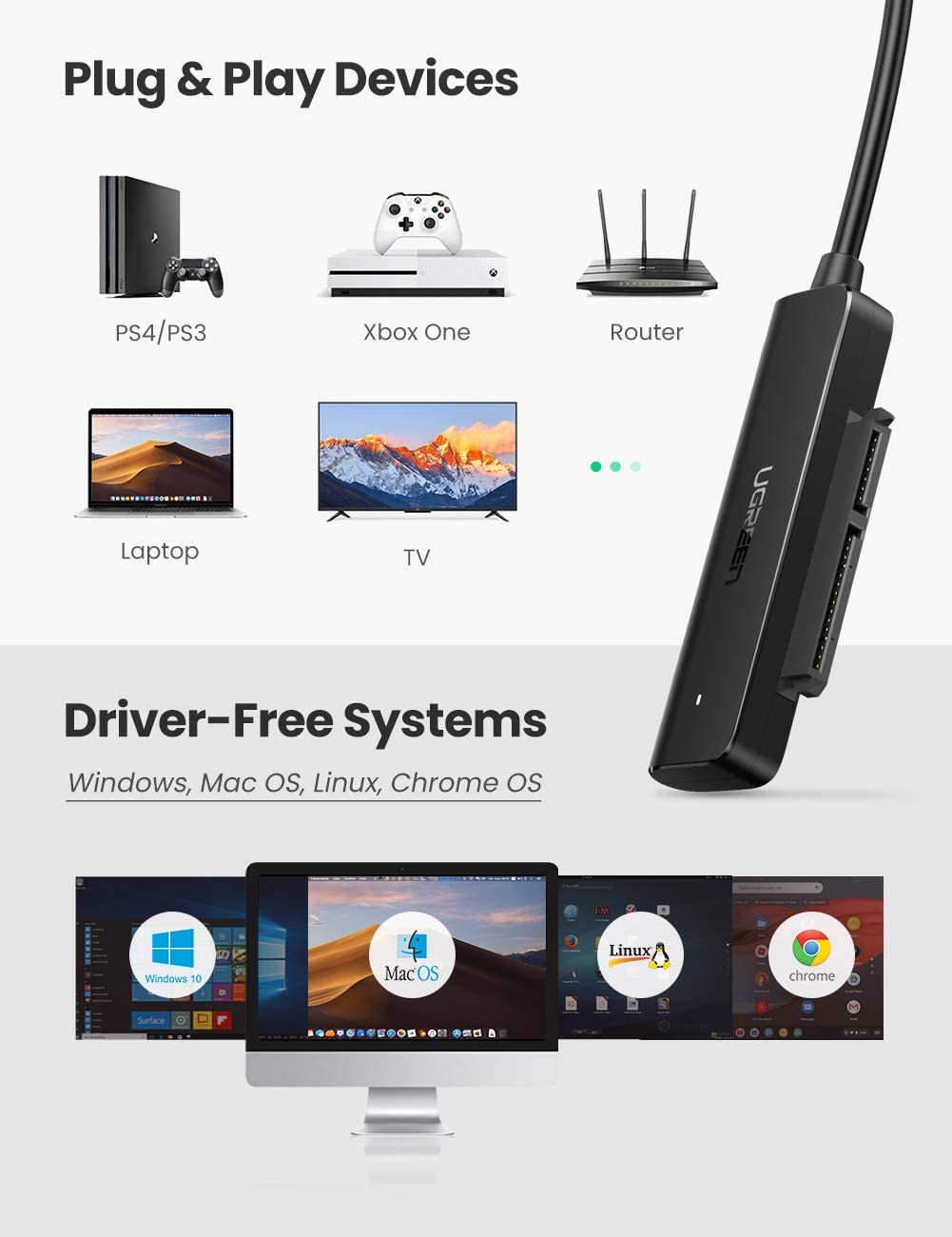- Cáp chuyển USB 3.0 Sang SATA III Ugreen 70609, truy cập nhanh chóng vào ổ cứng SSD / HDD SATA có thể dễ dàng kết nối ổ SSD hoặc ổ cứng SATA 2,5 inch với máy tính của bạn để mở rộng lưu trữ, nâng cấp hệ thống, sao lưu tệp, khôi phục và phục hồi dữ liệu cũng như truyền dữ liệu. Nó là tuyệt vời để khởi động ổ cứng cũ và khôi phục các tệp quan trọng từ PC bị hỏng. Không hỗ trợ ổ cứng 3,5 inch