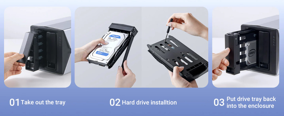 Hỗ trợ ổ cứng 2,5 inch & 3,5 inch: Đối với ổ cứng 3,5 inch, bạn không cần vít, ổ cứng 2,5 inch có thể được cố định chắc chắn trong ngăn bằng các vít đi kèm.