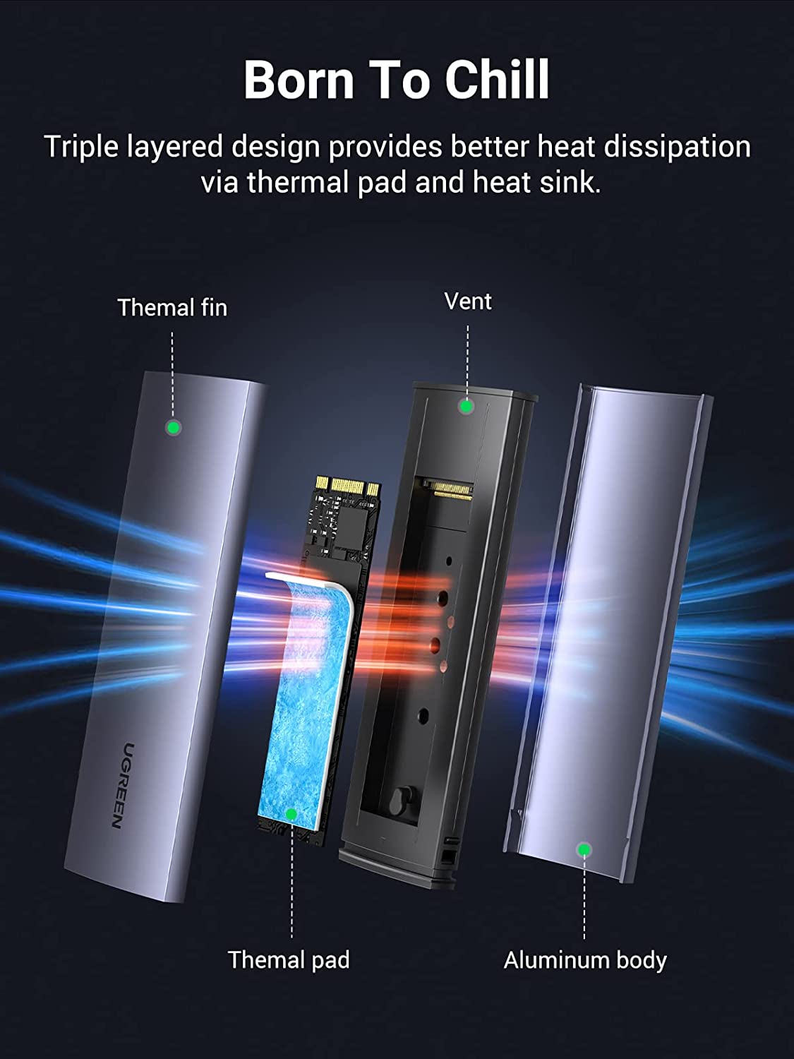 - Nhỏ gọn & Di động: Vỏ NVMe bên ngoài bằng nhôm siêu mỏng này có thêm vỏ silicon có thể di động nhưng bền và dễ mang theo hơn nhiều với bộ chuyển đổi M.2 sang USB này, khiến nó trở nên lý tưởng khi đi du lịch.