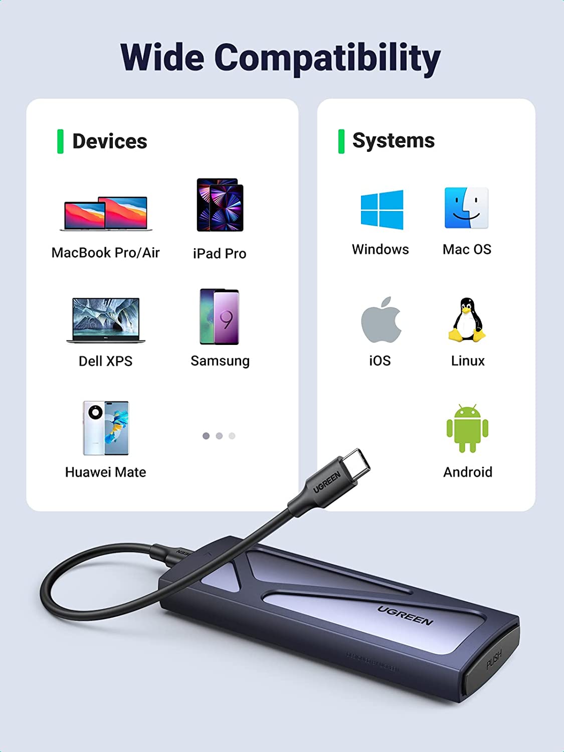 - Khả năng tương thích rộng: Vỏ SSD UGREEN M.2 NVMe được thiết kế đặc biệt cho Khóa M và B&M và cho SSD có kích thước 2230/2242/2260/2280 Tối đa 8TB. Vỏ M.2 NVMe có thể áp dụng cho các hệ thống Windows, Mac OS, Linux, Android, IOS.