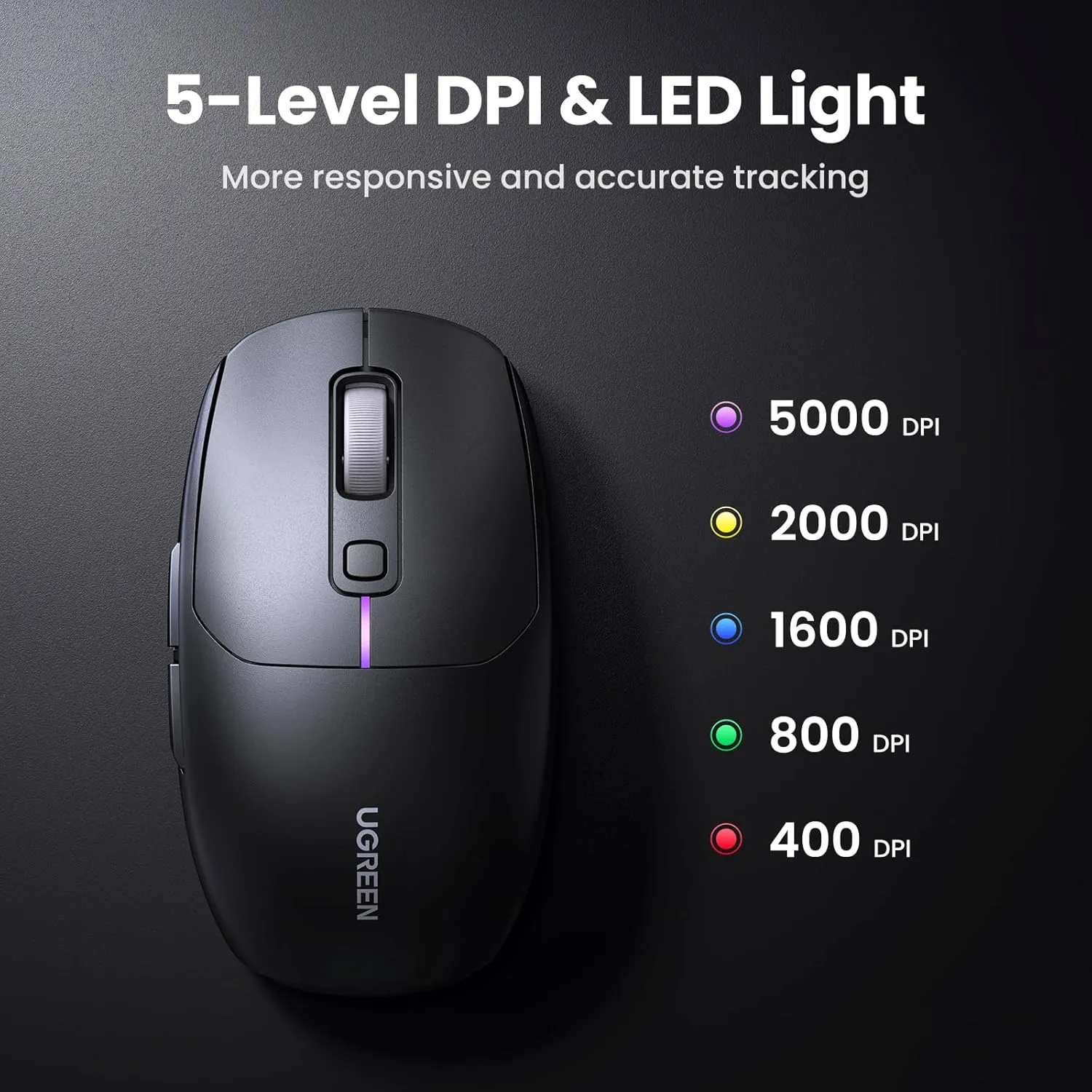 - Với 5 mức DPI có thể điều chỉnh (5000/2000/1600/800/400), chuột chơi game không dây hoạt động mượt mà và nhạy bén để đáp ứng các nhu cầu khác nhau. Nhu cầu về tùy chọn DPI từ 400 đến 5000 cũng có thể được xử lý bằng phần mềm.
