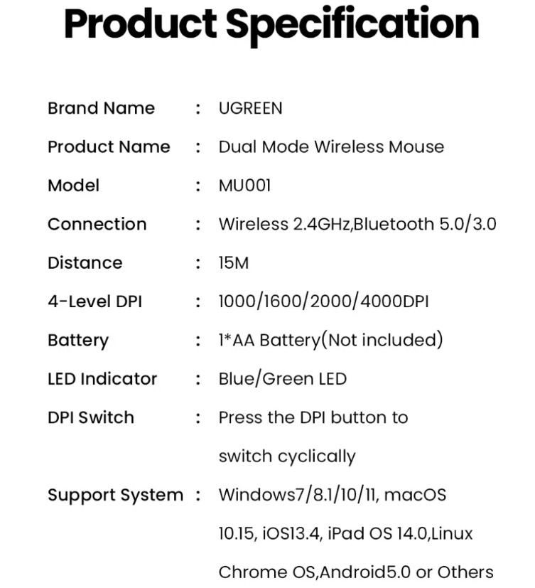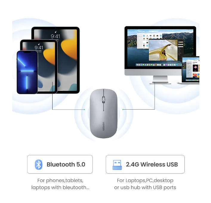 - Chuột không dây Bluetooth 5.0 Im lặng 4000 DPI Ugreen 25160 MU001 đáp ứng nhu cầu đặc biệt của bạn với độ nhạy cao hơn, khôi phục chính xác các chuyển động khi hoạt động tốc độ cao, hoàn hảo