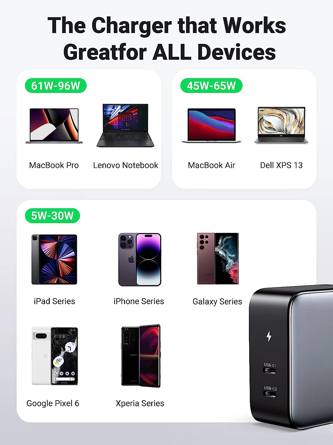 - Dual port output: C1+C2: 65W+30W/C1+C2: 30W+65W