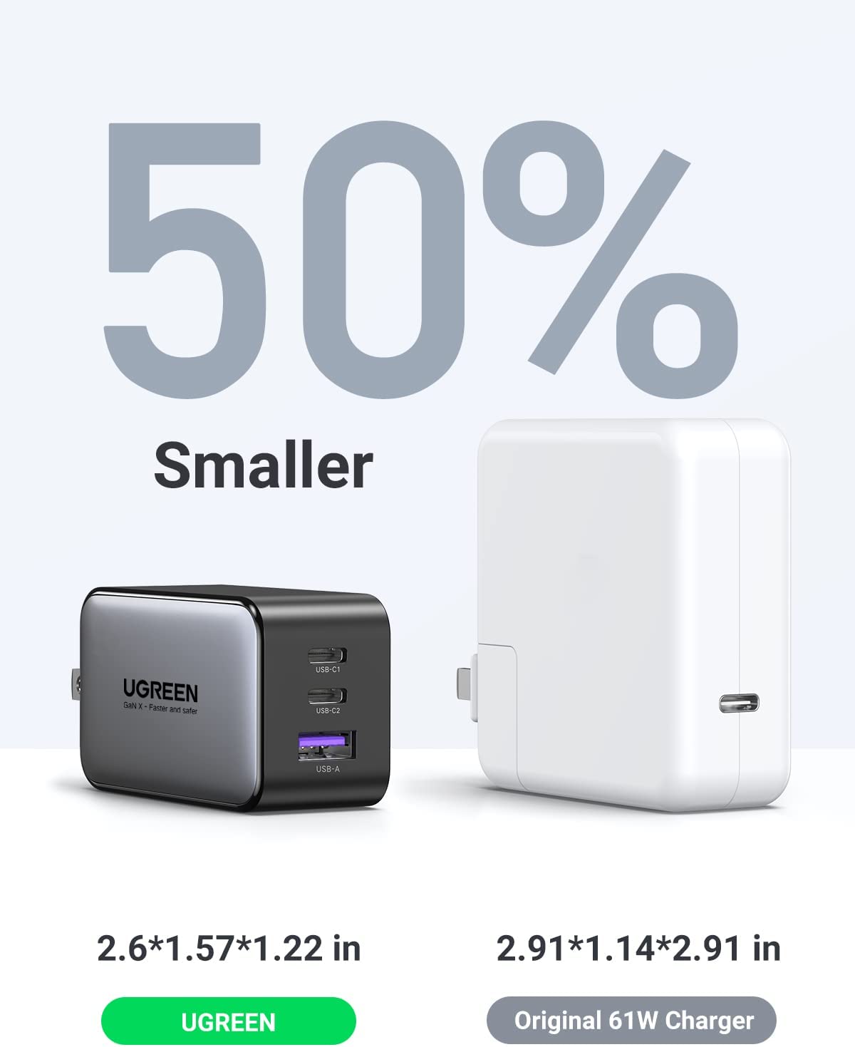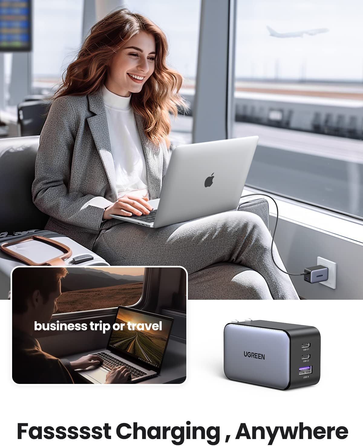 - Củ sạc nhanh GaN 65W Ugreen 10334, kết nối một thiết bị USB-C duy nhất để có mức sạc tối đa 65W. Sạc MacBook Air M2 lên 51% trong 30 phút.