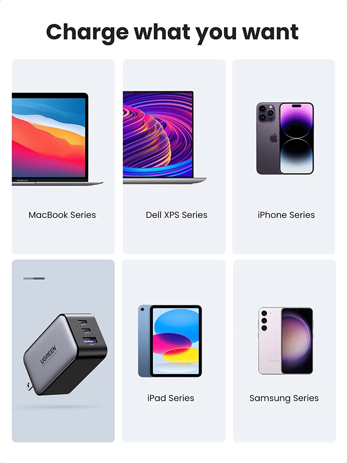 - Một bộ sạc, nhiều thiết bị hơn: Bộ sạc USB C 65W của Ugreen cung cấp công suất sạc khổng lồ 65W; đủ để sạc nhanh điện thoại, máy tính bảng và máy tính xách tay. Tất cả từ một bộ sạc duy nhất.