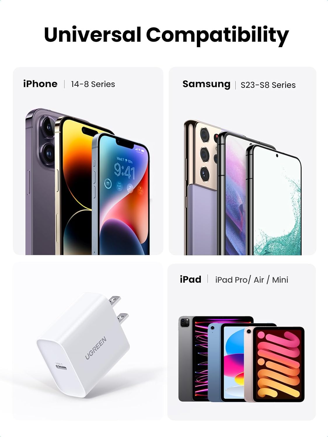 Củ sạc 18W hỗ trợ QC 4.0 tương thích rộng rãi với nhiều thiết bị như AirPods, Samsung Galaxy A51 / A31 / M31 / S10 + / S10 / S10e / S9 / S8, iPhone SE 2020 / iPhone 11/11 Pro / 11 Pro Max / XR / XS Max / XS / X / 8Plus / 8, iPad Pro 12.9 / 11 / iPad Air 3 / iPad Mini (2019), Google Pixel 4XL / 3a XL / 3a / Switch / 3 XL / 2 XL / 2 / XL / Pixel, Nintendo, LG G7 / V50 / V40 / V35 / V30 / V30s ThinQ
