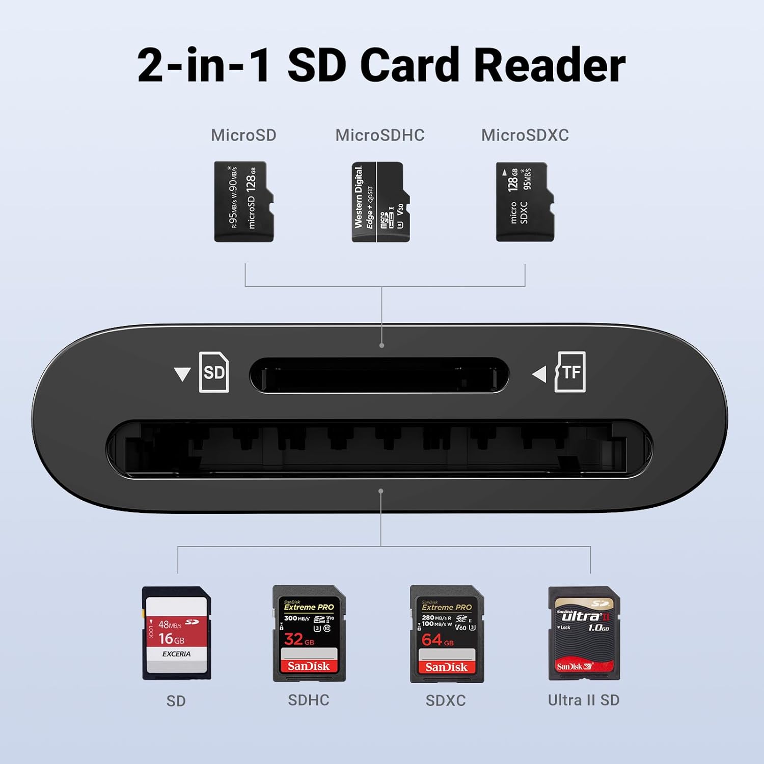 - Đọc đồng thời 2 thẻ: Đọc và ghi đồng thời trên 2 thẻ nhớ ngoài (SD/Micro SD) để tiết kiệm việc cắm rút phích cắm liên tục, Hỗ trợ UHS-I SD, SDHC, SDXC, Micro SD, Micro SDHC, Micro SDXC và Thẻ MMC RS-MMC. Lưu ý: Bộ chuyển đổi thẻ SD này hỗ trợ thẻ SD/TF UHS-II, nhưng tốc độ sẽ là UHS-I.