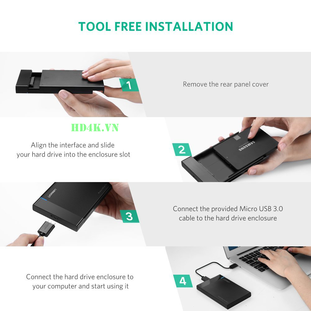 - Box ổ cứng USB 3.0 chính hãng Ugreen 30848 dùng cho ổ cứng HDD, SSD 2.5" chuẩn SATA III và tương thích ngược với SATA II, hỗ trợ Plug And Play (cắm là nhận) tương thích với hầu hết hệ điều hành Windows 7/8/8.1/10/Vista/XP, Linux, Mac OS... HDD Box Ugreen là giải pháp di động tuyệt vời không thể thiếu trong bộ sưu tập phụ kiện của bạn.