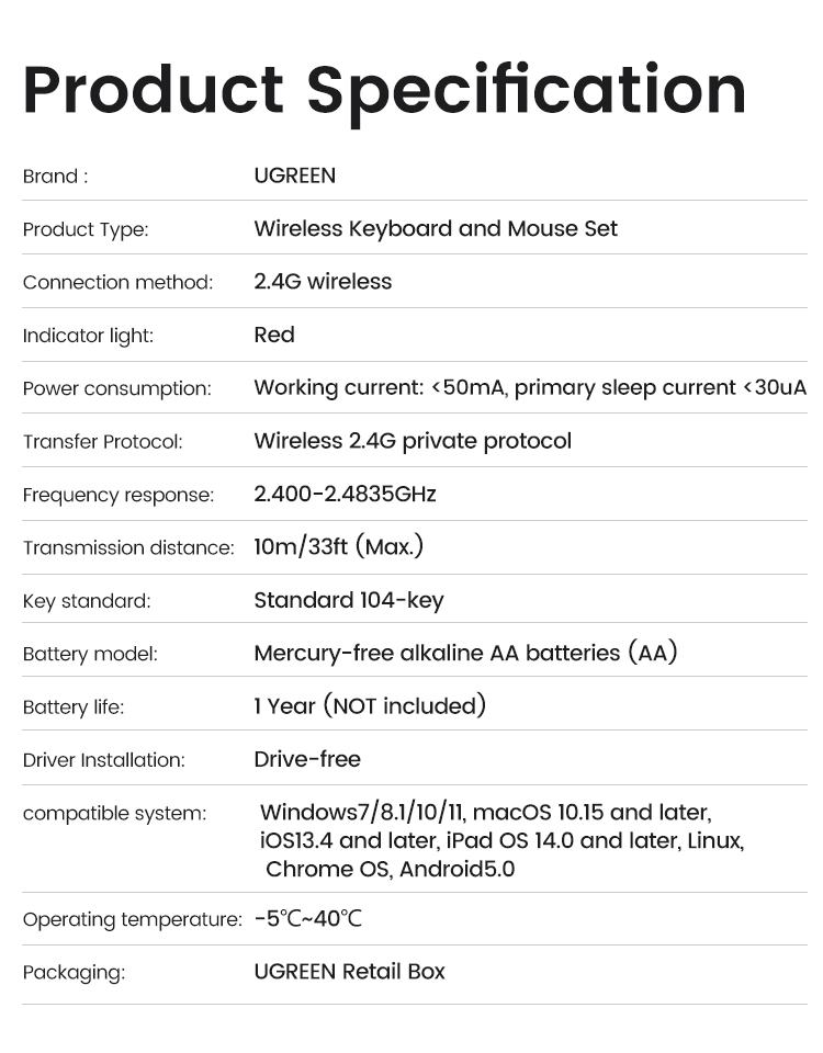 Bàn phím không dây 2.4Ghz dùng cho máy tính laptop chất liệu nhựa ABS màu đen Ugreen 90250