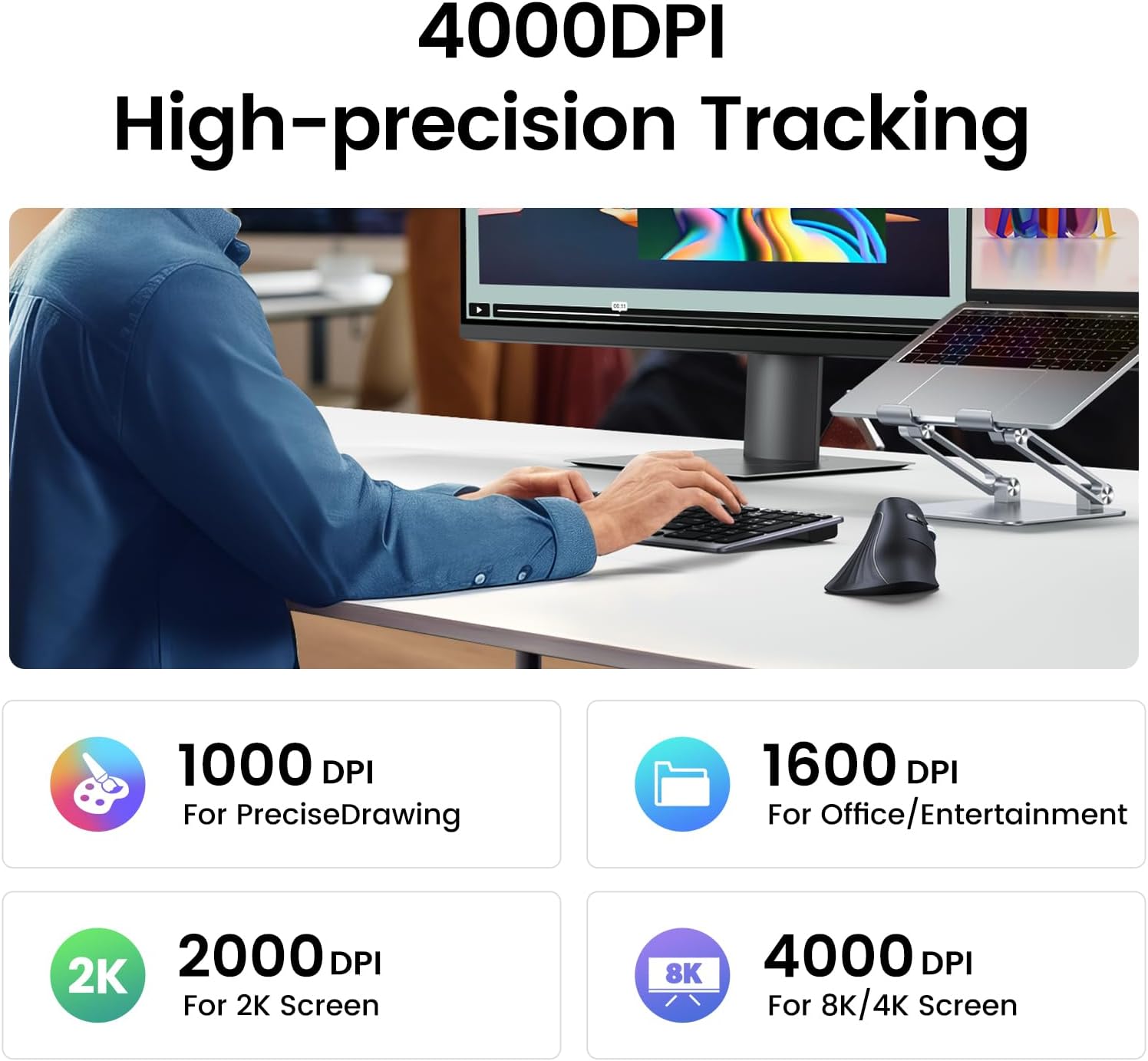 - DPI cao và mức có thể điều chỉnh: Chuột công thái học này cung cấp phạm vi DPI cao với bốn mức có thể điều chỉnh: 1000, 1600, 2000 và 4000. Điều này mang lại độ chính xác và khả năng kiểm soát đặc biệt cho cả ứng dụng máy tính để bàn và chơi game