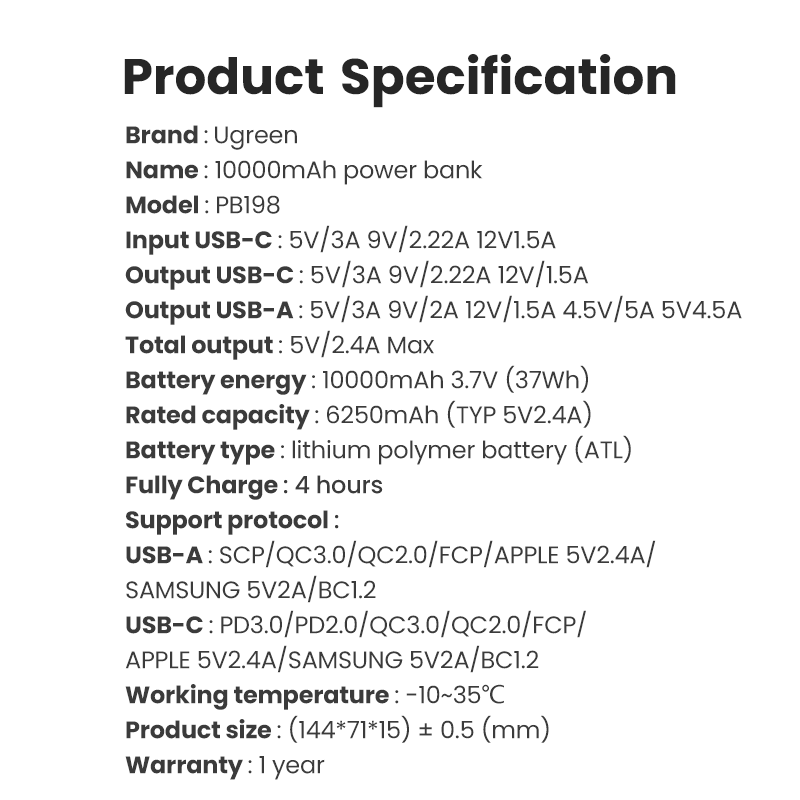 - USB-C Input/Output: 5V/3A 9V/2.22A 12V/1.5A