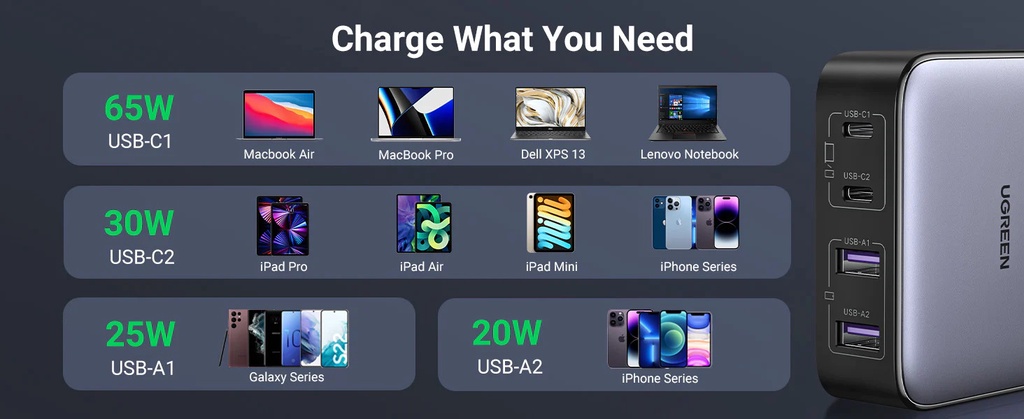 - Four port output: C1+C2+A1+A2: 30W+20W+5V3A