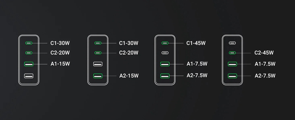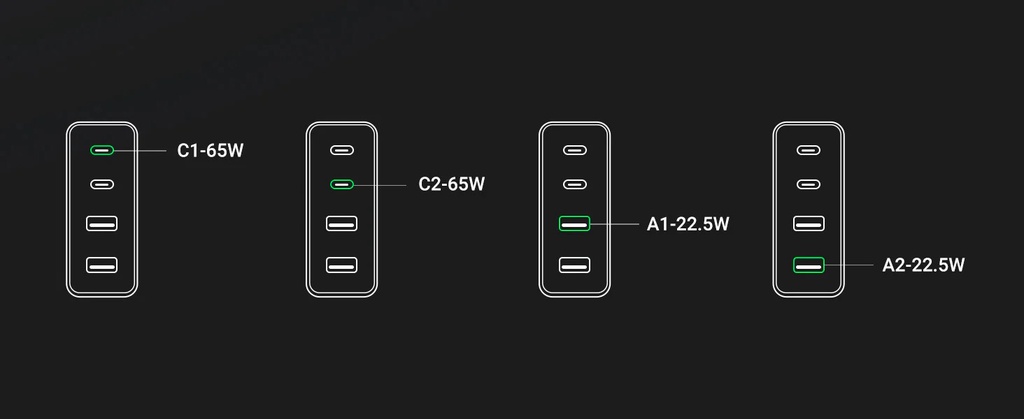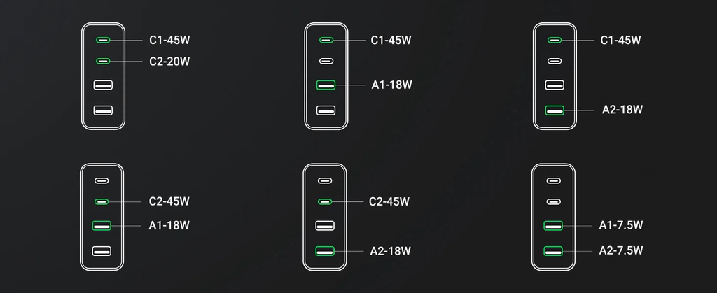 - Dual port output:C1+C2: 45W+20W;C1/C2+A1/A2: 45W+18W; A1+A2:5V3A