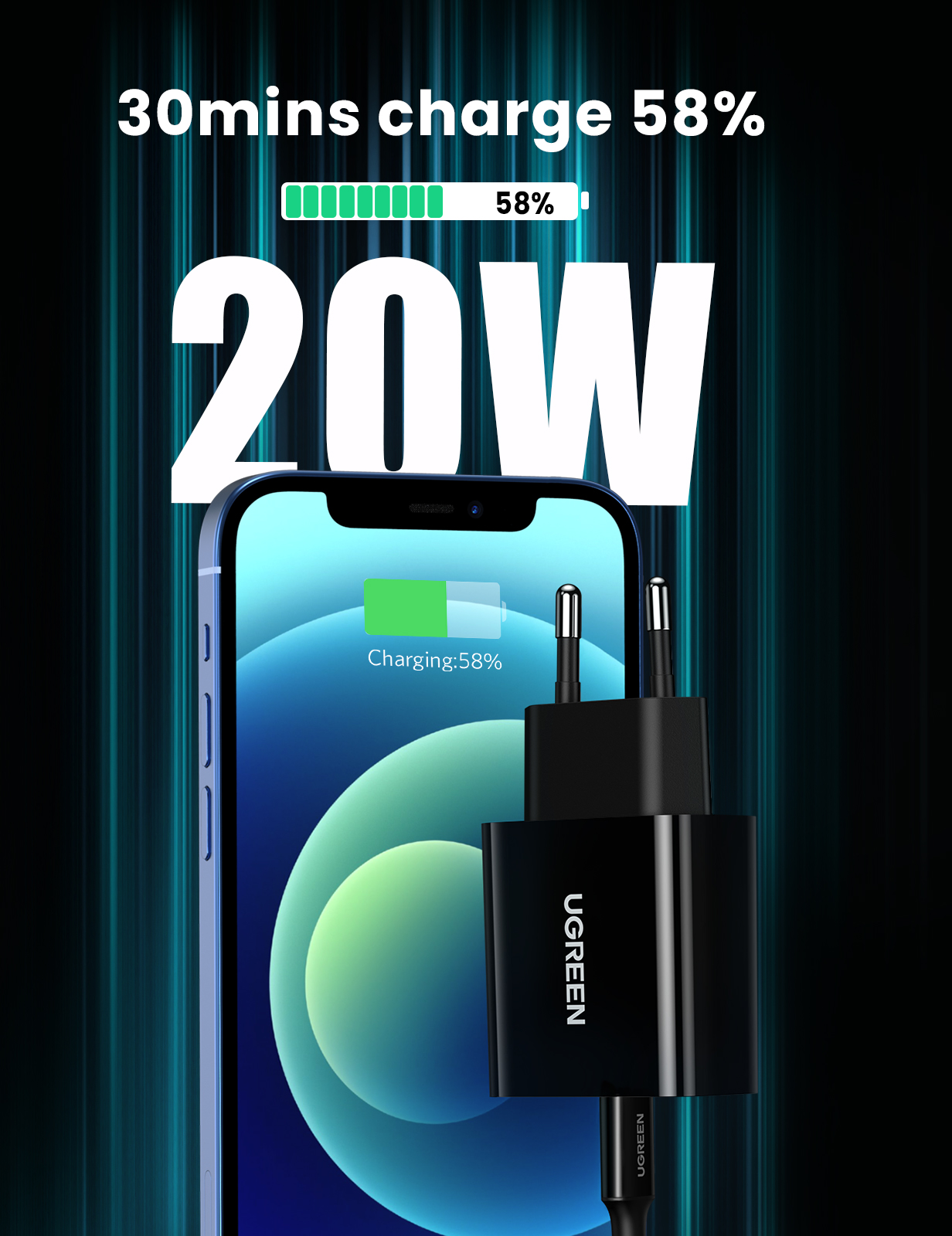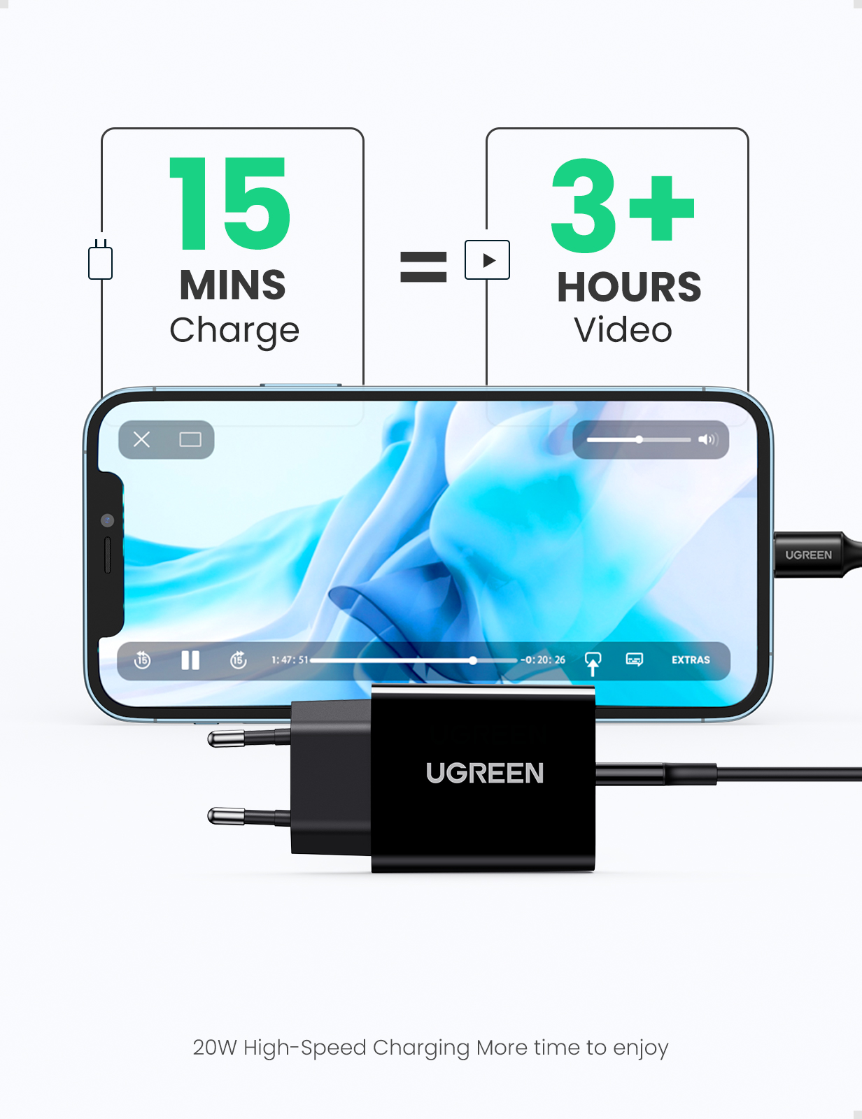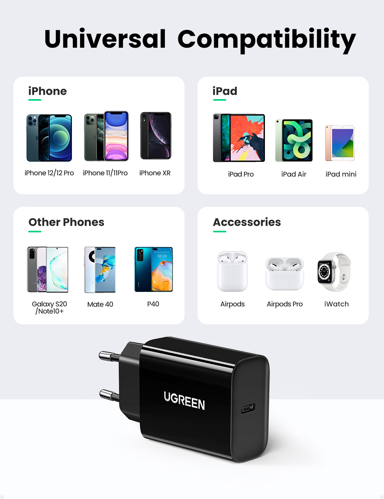 Sạc điện thoại cổng USB-C trợ PD 20W màu đen cáp Type-C to lightning chân EU Ugreen 50799