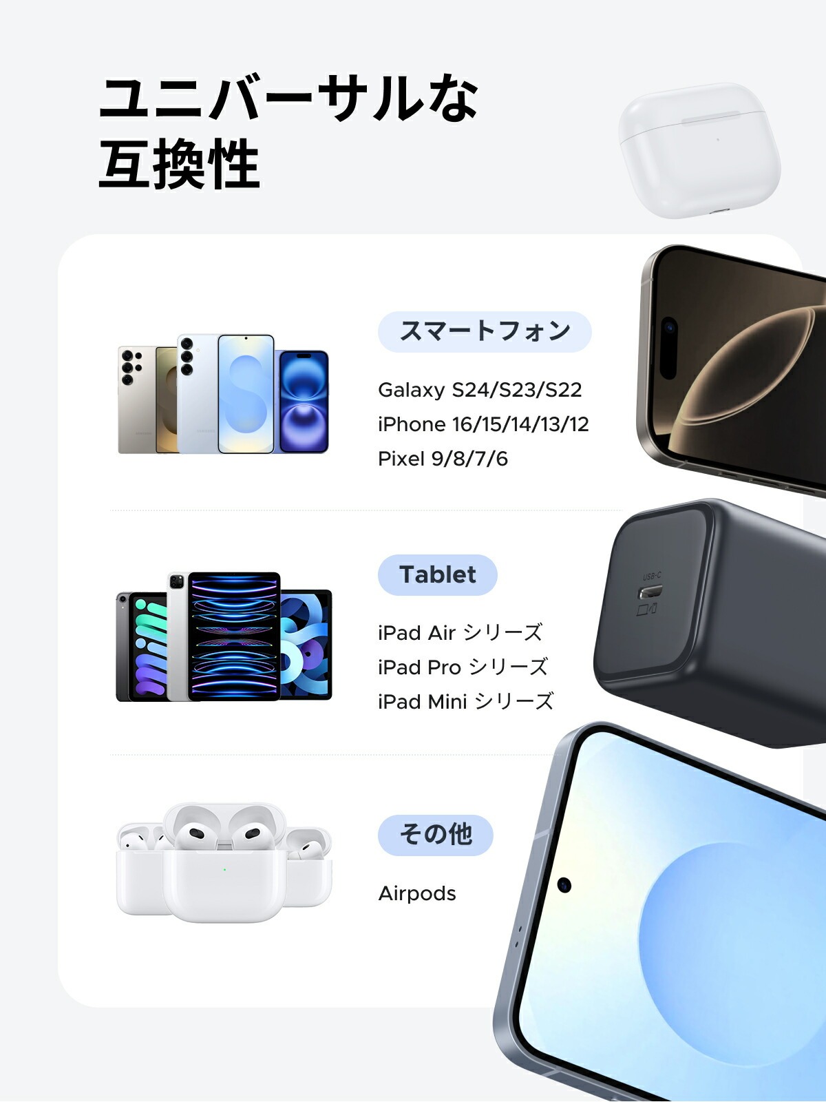 - Tương thích đa thiết bị: Laptop hỗ trợ sạc USB-C (MacBook Air, Surface, Dell XPS…), tablet, smartphone, tai nghe, pin sạc dự phòng.
