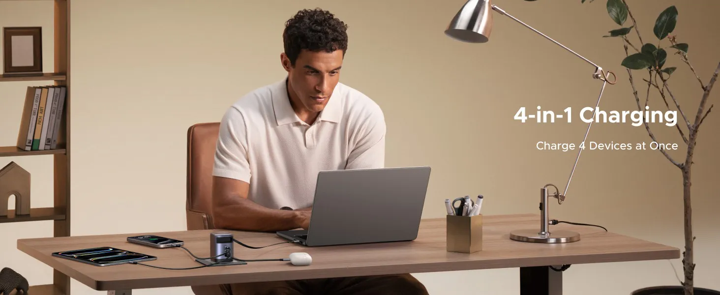 - Sạc nhiều thiết bị cùng lúc: Vừa sạc laptop + điện thoại + tai nghe không dây trong cùng một thời điểm. Cổng USB-A hỗ trợ Quick Charge / Huawei SuperCharge → tương thích với cả thiết bị đời cũ.