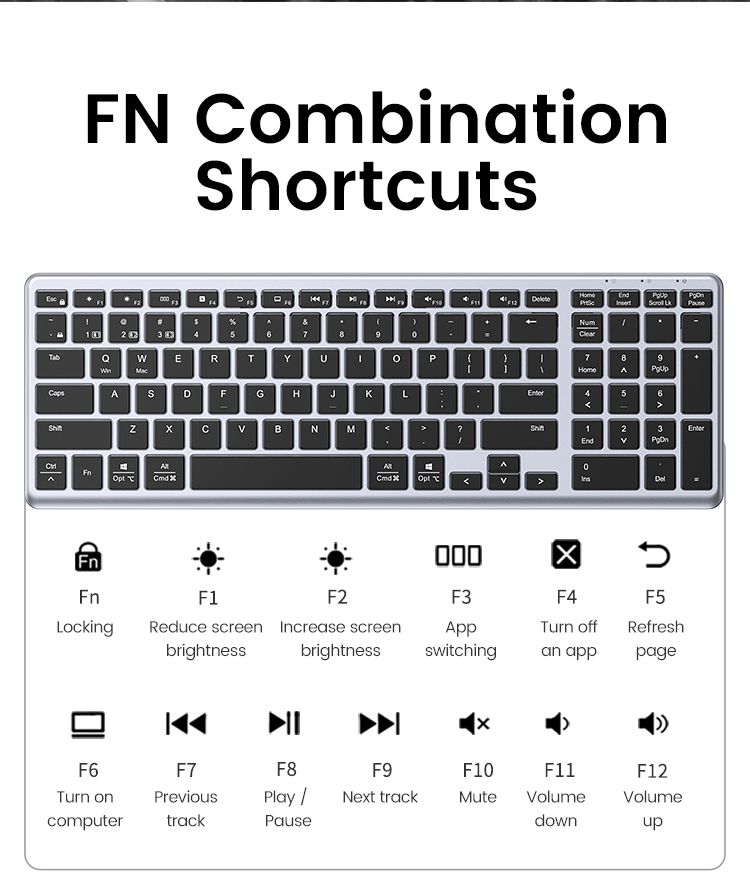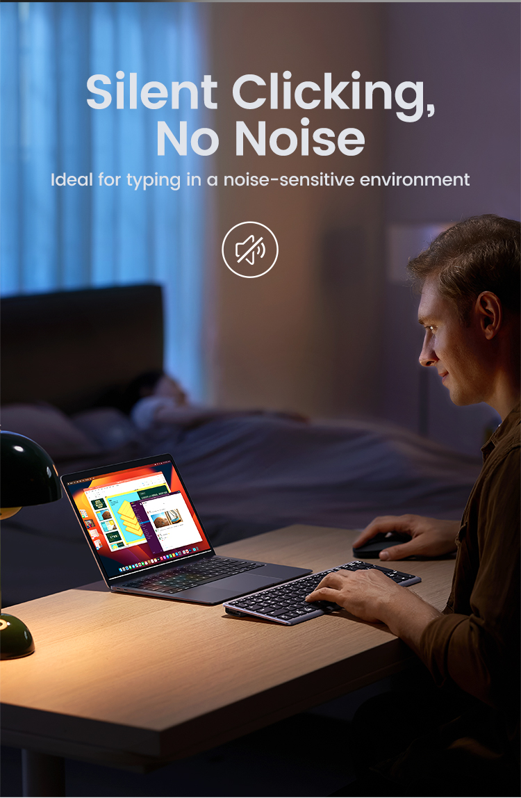- Bàn phím đa nhiệm: Bàn phím UGREEN Wireless Ultra Slim không chỉ hỗ trợ các tính năng cơ bản của một bàn phím thông thường mà còn có các phím chức năng phổ biến như điều khiển âm lượng, chức năng điều hướng, và các phím tắt đa phương tiện.