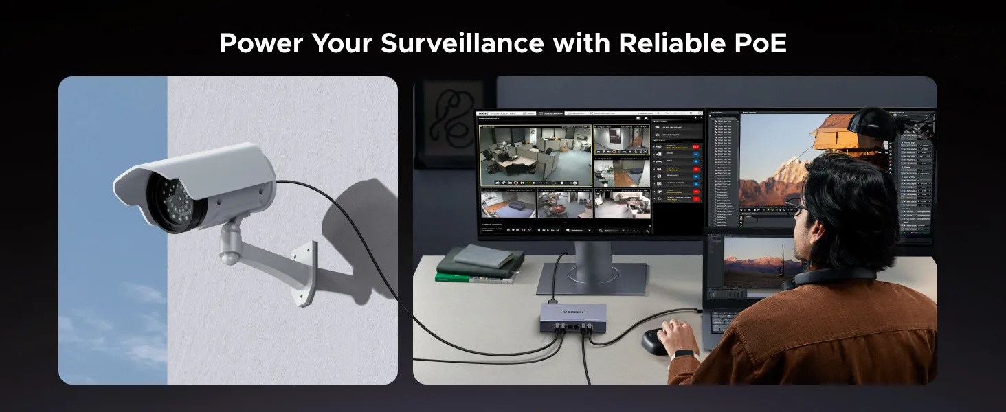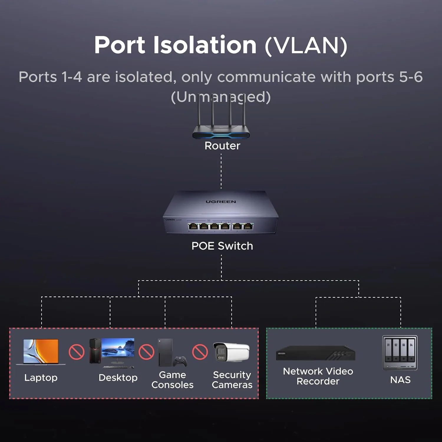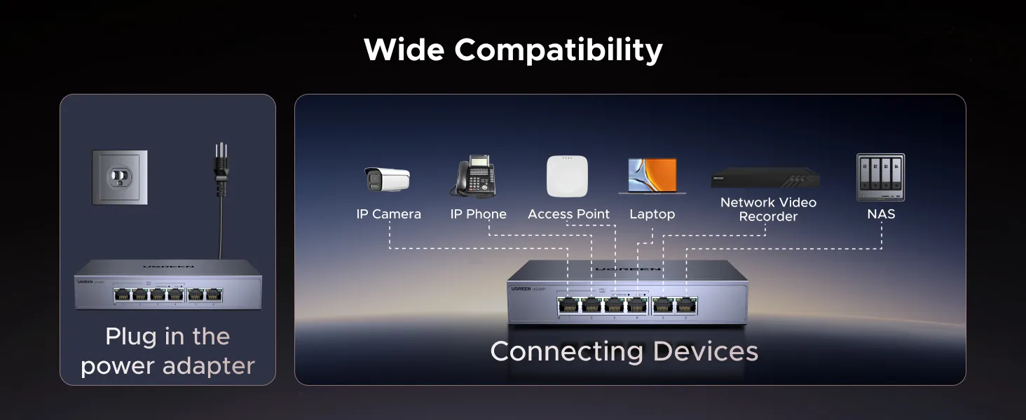 - Nhiều cổng hơn, hỗ trợ PoE: Bộ chuyển mạch Ethernet UGREEN cung cấp 4 cổng Gigabit PoE+ (802.3at/af) (công suất lên đến 30W mỗi cổng) và 2 cổng Gigabit uplink, với tổng công suất lên đến 60W. Lý tưởng cho việc phân phối điện năng hiệu quả và kết nối mạng liền mạch.