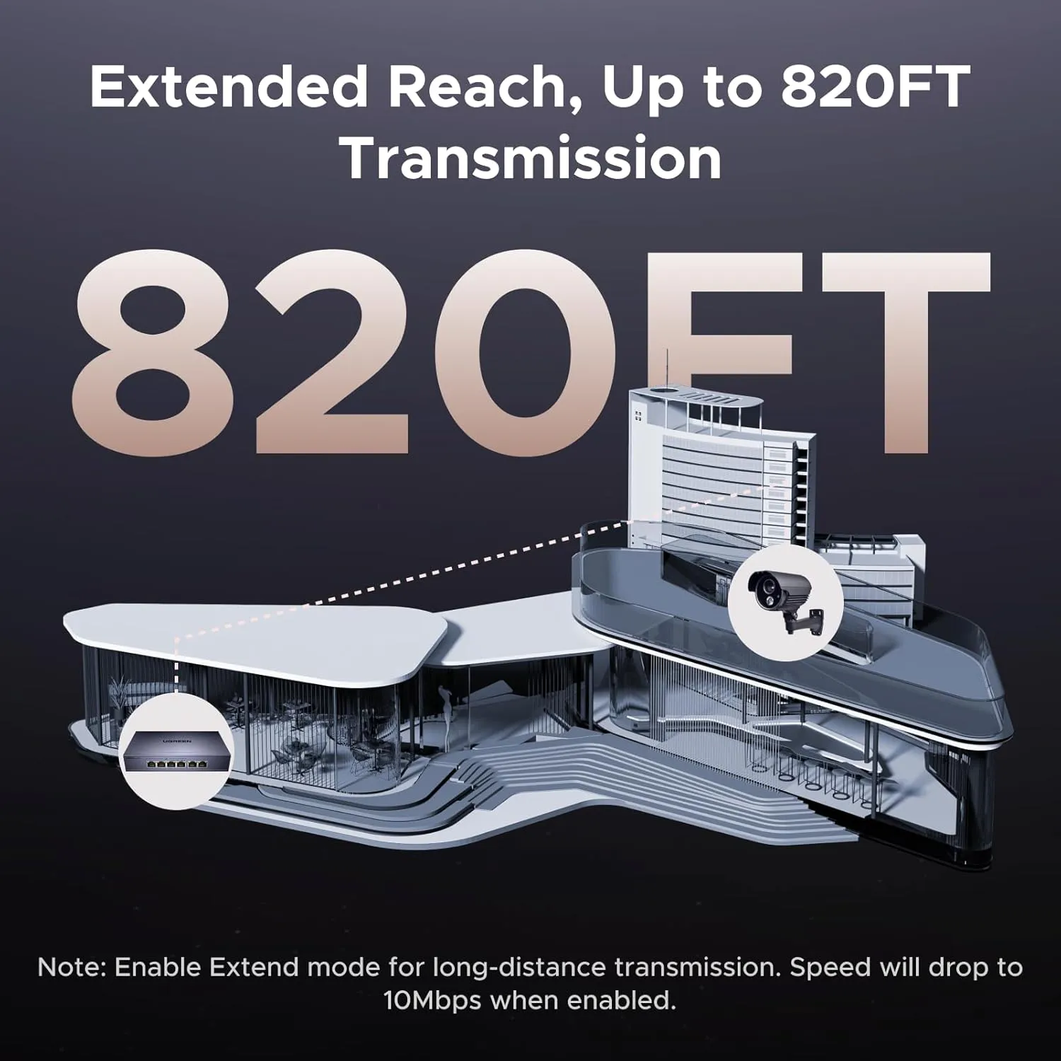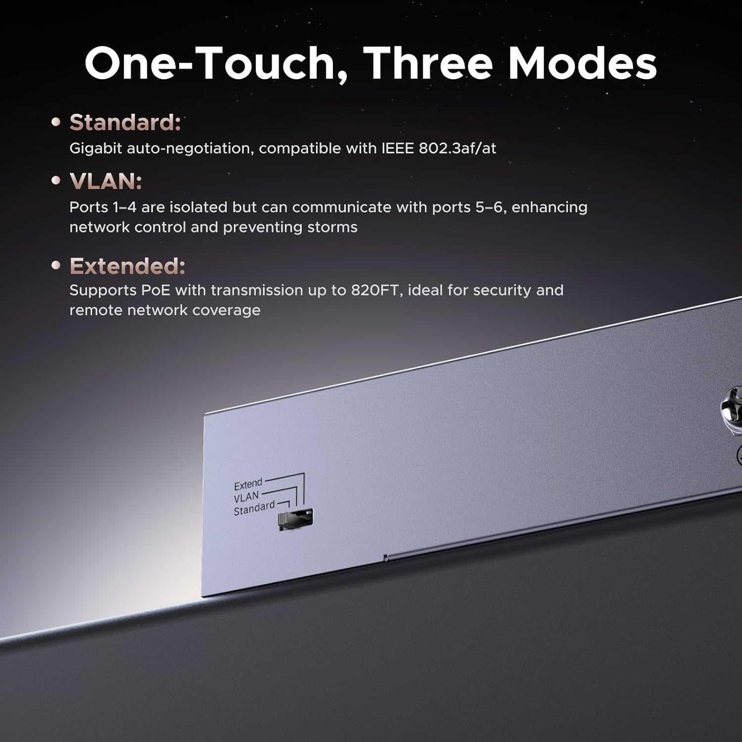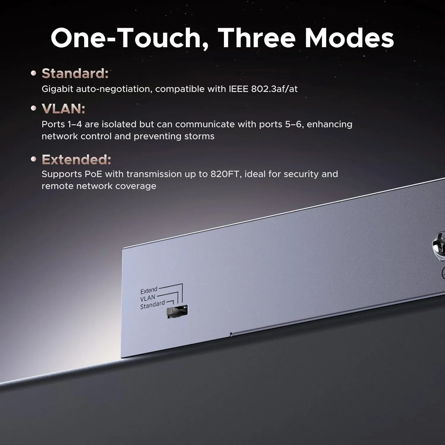 - Một chạm, ba chế độ: Bộ chuyển mạch Ethernet có thể dễ dàng chuyển đổi giữa các chế độ Chuẩn, VLAN và Mở rộng. VLAN sẽ cô lập các cổng 1-4 để quản lý tốt hơn và ngăn ngừa nhiễu. Chế độ mở rộng hỗ trợ PoE lên đến 820FT, lý tưởng cho bảo mật và phủ sóng mạng từ xa.