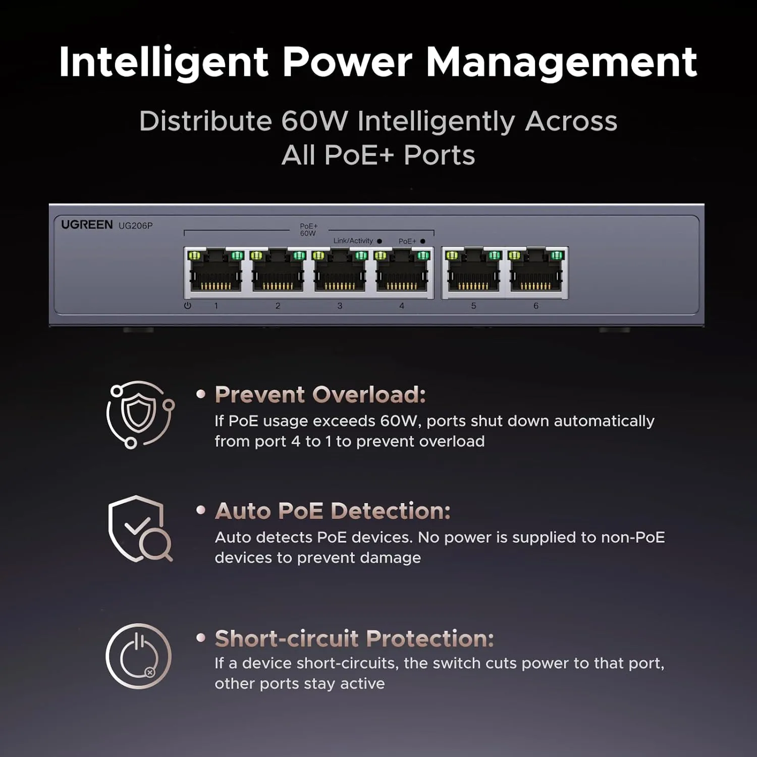 - Quản lý nguồn thông minh: Nếu công suất vượt quá 60W, bộ chuyển mạch sẽ tự động cắt các cổng theo thứ tự ưu tiên (4–1) để tránh quá tải. Bộ chuyển mạch tự động phát hiện các thiết bị PoE, cấp nguồn cho chúng và chỉ truyền dữ liệu đến các thiết bị không hỗ trợ PoE. Các cổng bị đoản mạch sẽ tự động tắt..