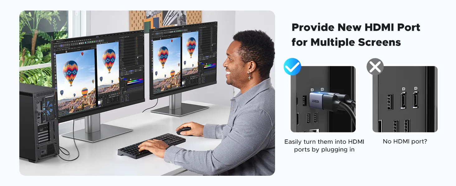 - Tương thích phổ quát: Tương thích với máy tính xách tay, máy tính để bàn, card đồ họa (AMD, NVIDIA) có cổng DP. Kết nối với TV, máy chiếu, màn hình, tai nghe VR hoặc các thiết bị khác có cổng HDMI để truyền video và âm thanh. Không tương thích với các thiết bị nguồn HDMI như MacBook, PS, Switch và Xbox.