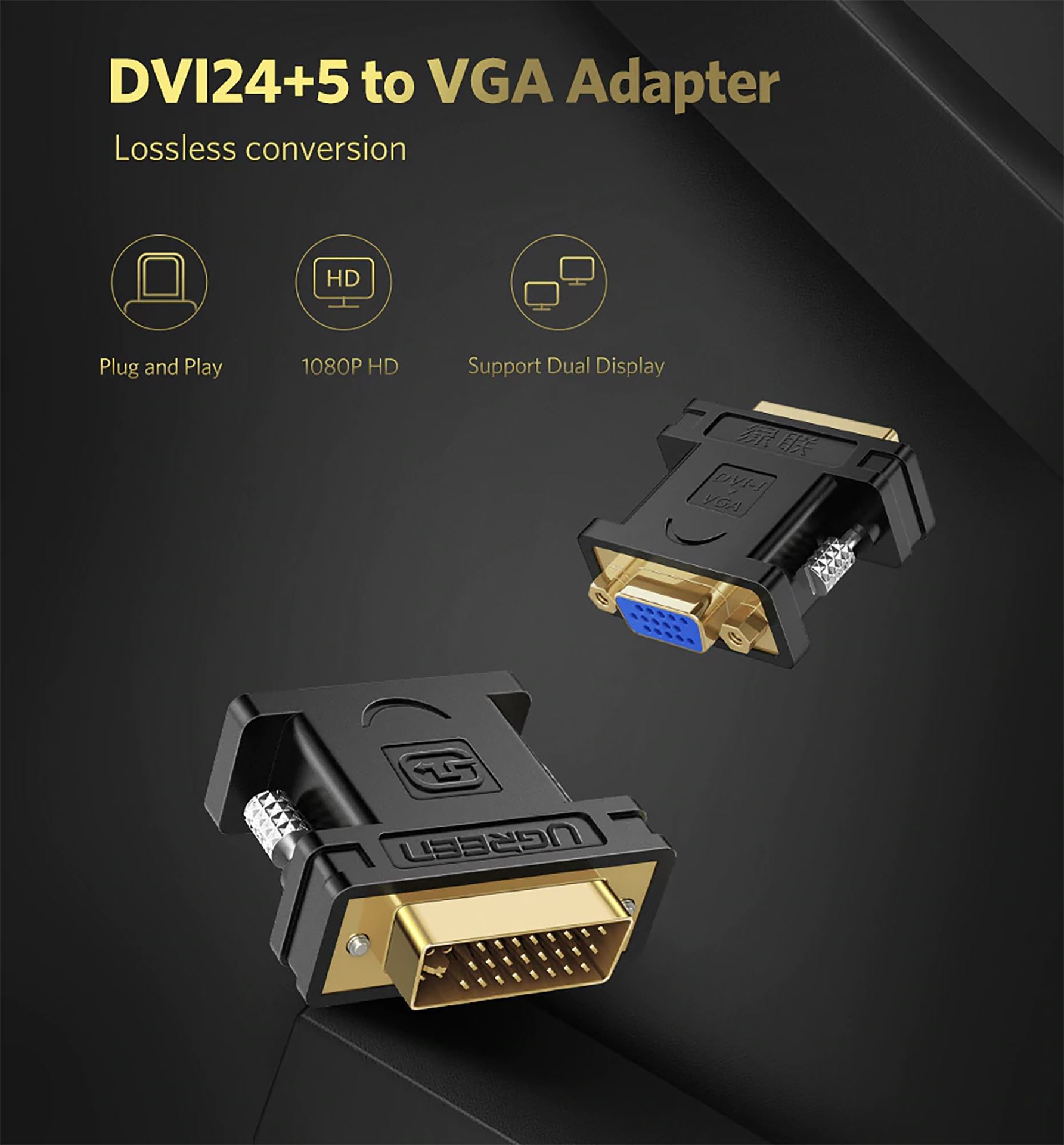 - Đầu chuyển DVI 24+5 to VGA ugreen 20122 cho bạn một cách hiệu quả về chi phí để kết nối HDTV, Máy chiếu hoặc Màn hình với VGA tới máy tính PC hoặc Mac với Thẻ Video Tương tự DVI với độ phân giải lên đến 1080P.