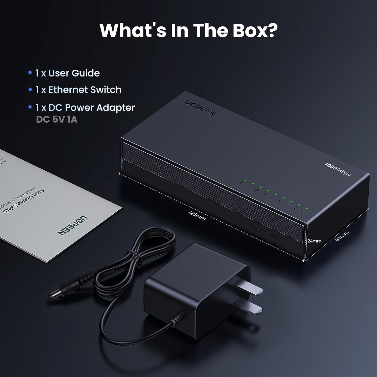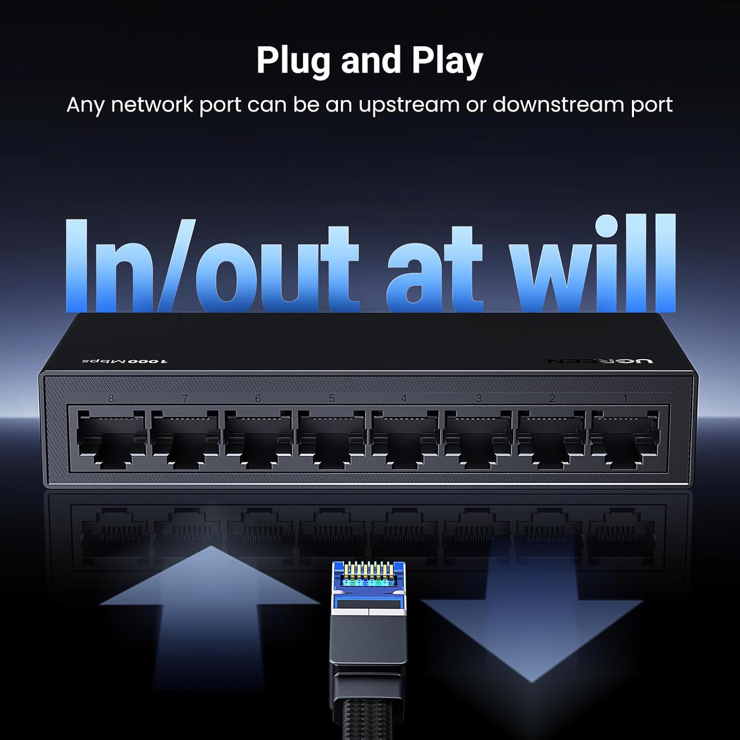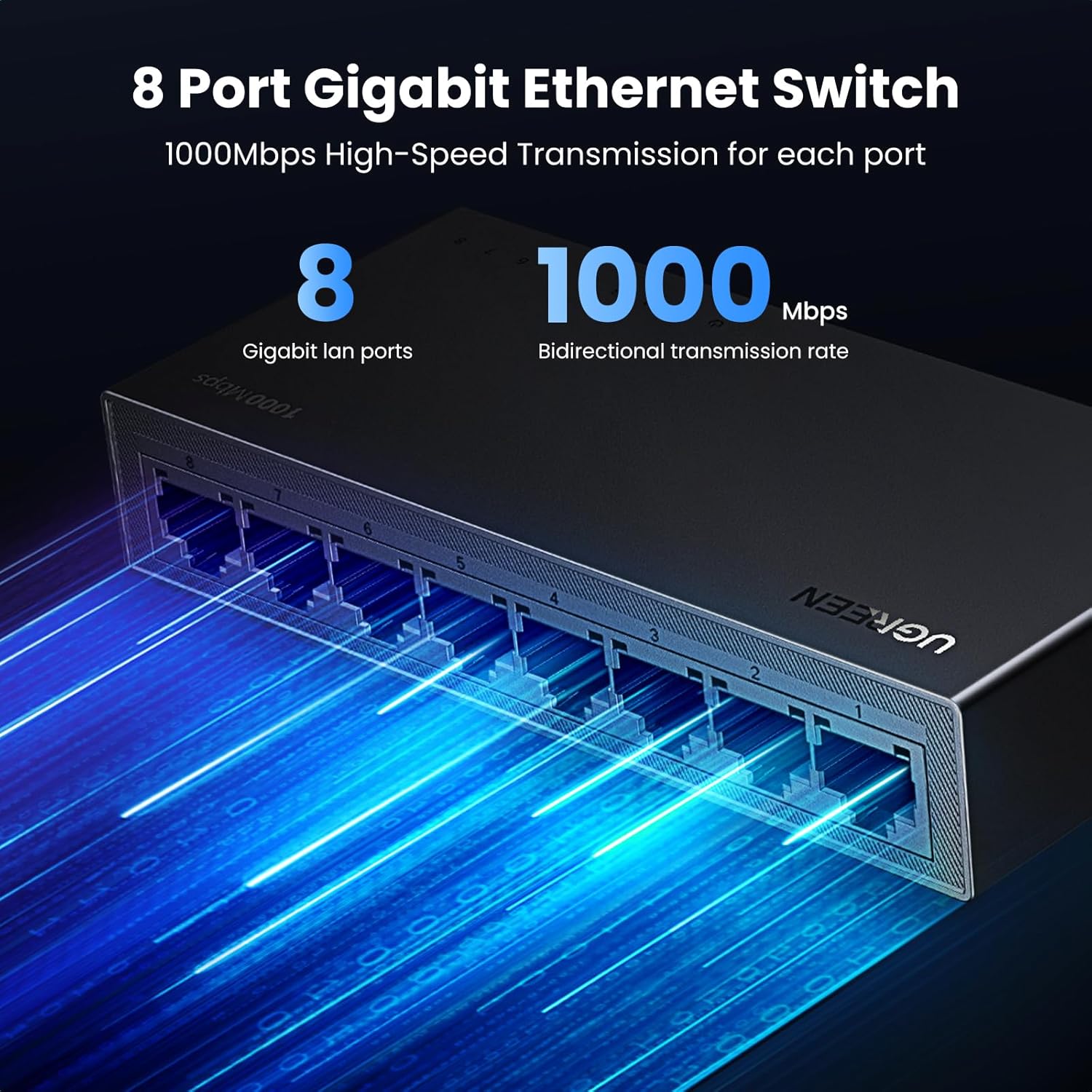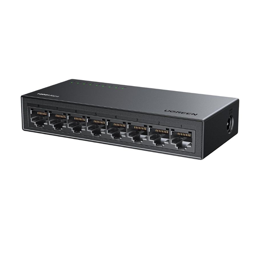 Bộ chia mạng gigabit 8 cổng Ugreen 35499EU CM834: Bộ chuyển mạch Ethernet UGREEN với 8 cổng Gigabit RJ45 có đèn báo, hỗ trợ điều chỉnh tự động theo tốc độ mạng 10/100/1000Mbps, hỗ trợ chế độ song công hoàn toàn và bán song công, hỗ trợ chức năng lật MDI/MDIX tự động