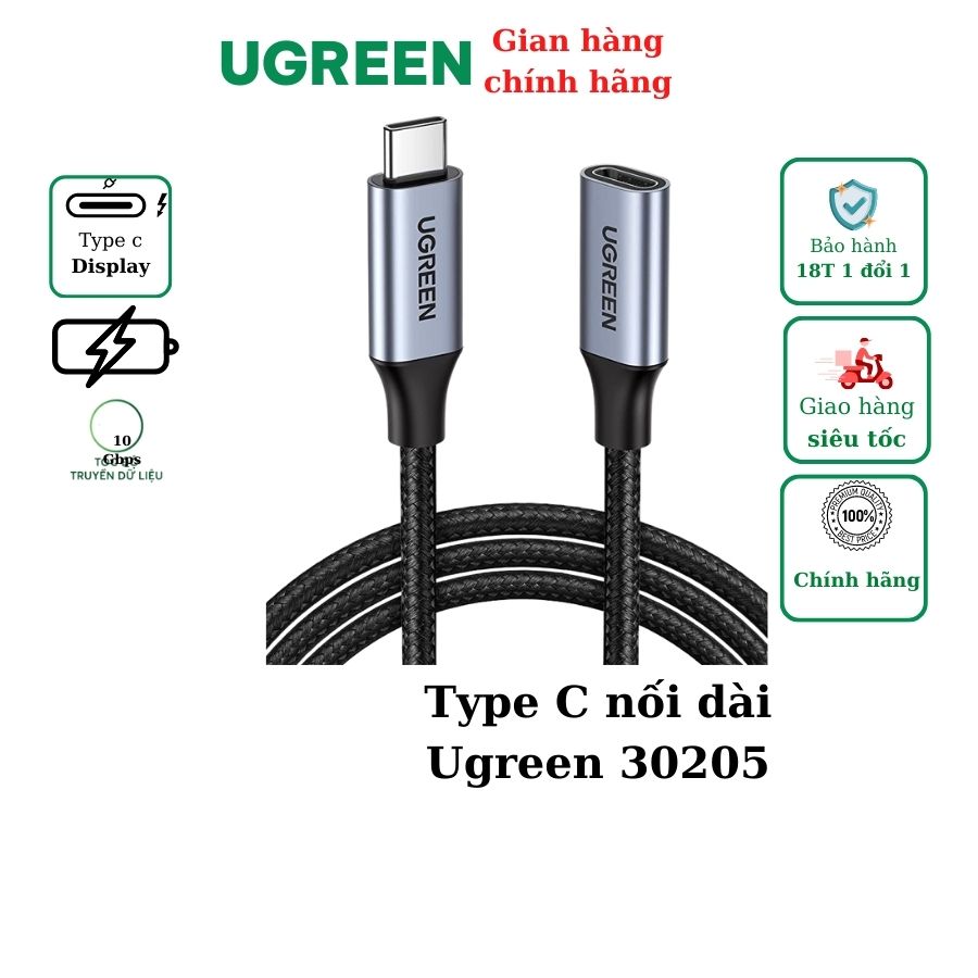 - Cáp nối dài Type C dài 1M Ugreen 30205 cung cấp tốc độ sạc lên đến 100W (20V 5A) và tốc độ truyền dữ liệu lên đến 10Gbps, truyền các tệp lớn chỉ trong vài giây.