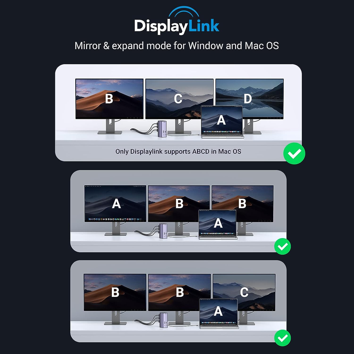 - Mở rộng ba màn hình: Với công nghệ DisplayLink, hỗ trợ bạn mở rộng 3 màn hình cho các hệ thống mày tính Windows và macOS. Nó hỗ trợ cả chế độ mở rộng (Extend Mode) và chế độ phản chiếu (Duplicate mode), có thể cải thiện đáng kể hiệu quả công việc của bạn. (Lưu ý: Các chức năng hiển thị và mạng cần cài đặt trình điều khiển)