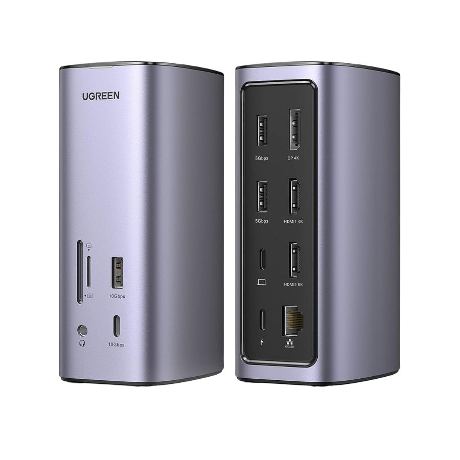 - Bộ chuyển Type C sang 3*USB 3.0+2*HDMI+1DP+RJ45+SD&TF+3.5mm Ugreen (90325) có : 1x HDMI 8K, 1xHDMI 4K, 1x DP 4K, 1x PD 3.0 100w, 1x USB A 3.2, 1x USB C 3.2 , 2x USB A 3.0, 1x Gigabit Ethernet, 1x khe cắm thẻ nhớ SD/Micro SD và 1x cổng AUX 3,5mm. Nó có thể đáp ứng hầu hết mọi nhu cầu trong công việc hàng ngày của bạn.