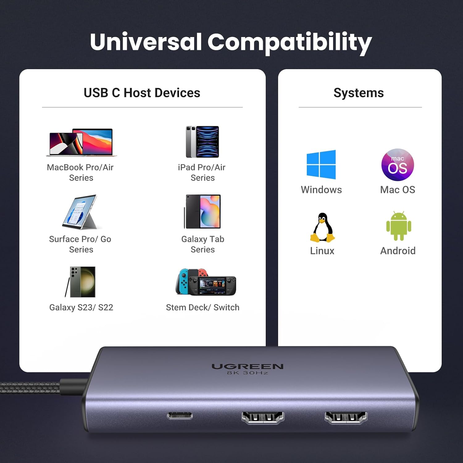 - Màn hình 8K UHD: Cổng HDMI 2 trên Bộ chuyển đổi HDMI kép USB C mang lại độ phân giải tối đa 8K @ 30Hz, tạo ra chi tiết đáng kinh ngạc và màu sắc cực kỳ sống động. Tạo hoặc thưởng thức nội dung trực quan chưa bao giờ tốt hơn thế.